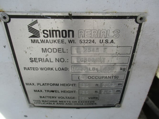 1000 lb. Simon Aerials #L2548-E, scissor lift, 25' lift height